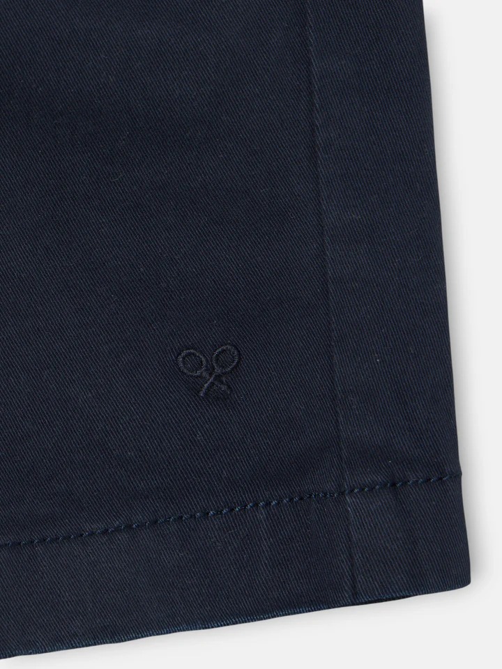 - Bermuda clásica confeccionada en mezcla de algodón de corte Regular fit. Presenta cierre con botón personalizado , cremallera y cordones ajustables trabillas en cintura y bolsillos delanteros y traseros. Cuenta con detalle de raquetas bordadas delanteras y traseras.