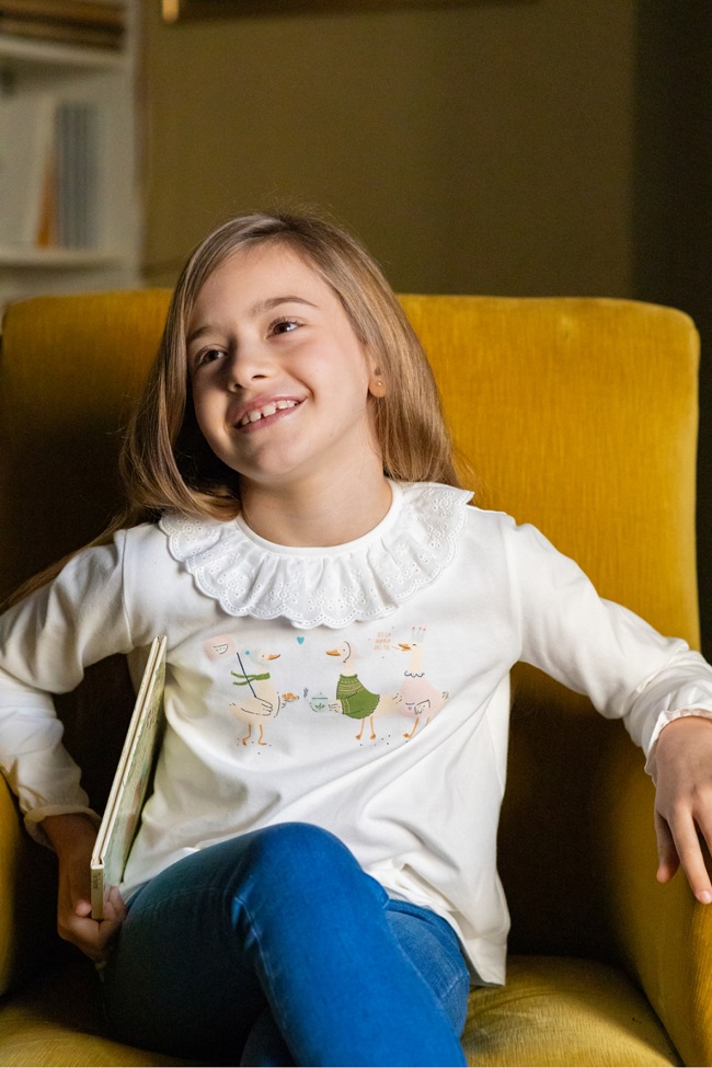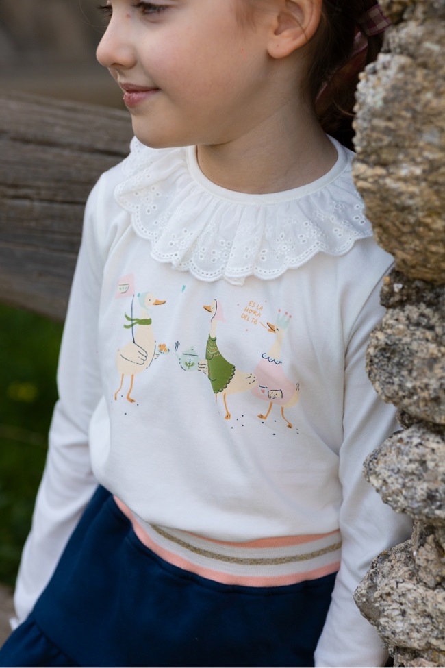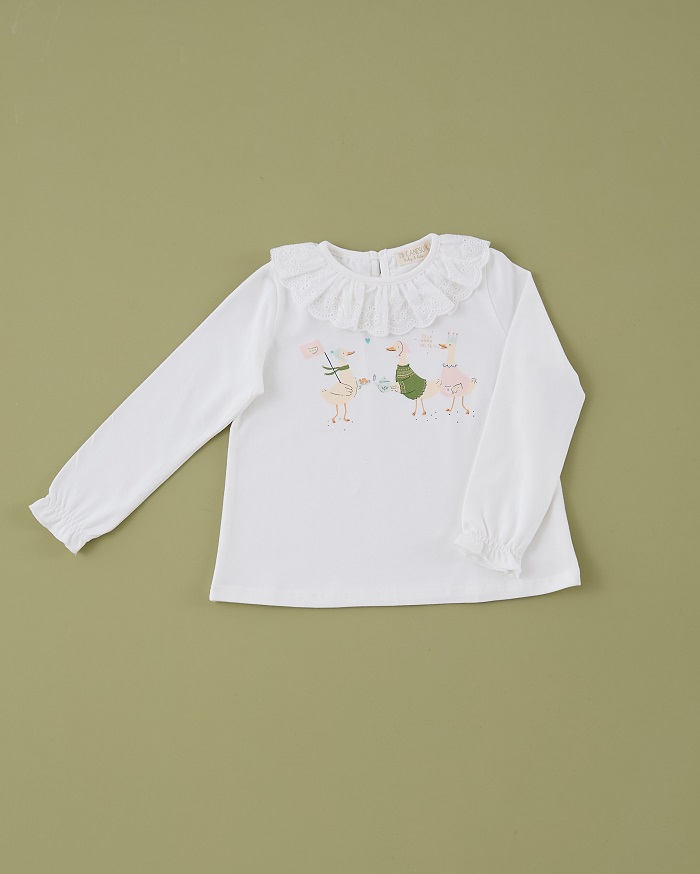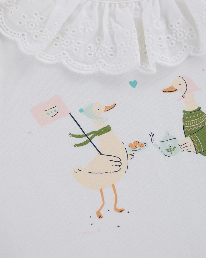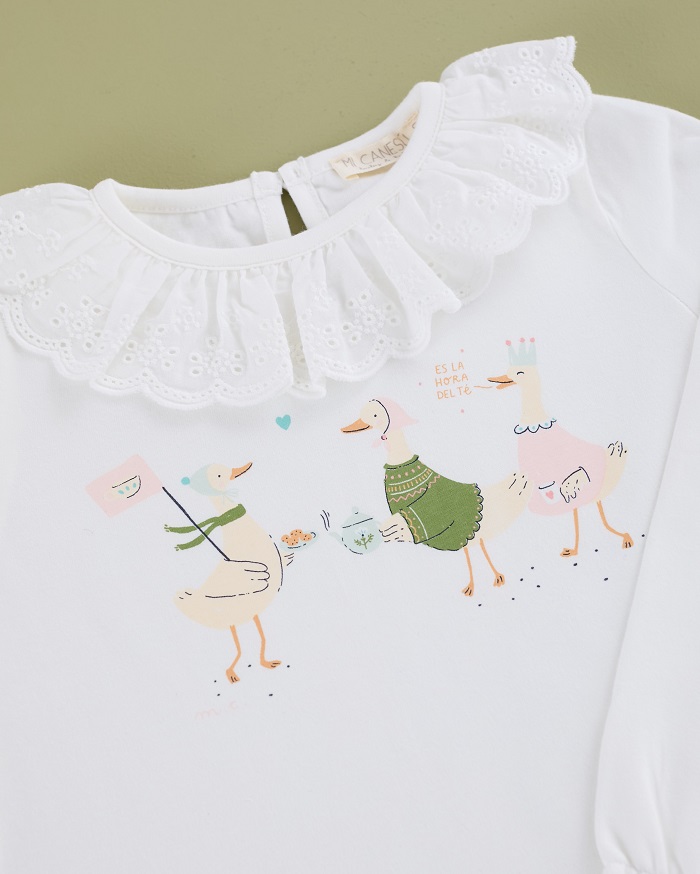 - Camiseta con cuello volante de puntilla e ilustración de tres lindos patitos.
