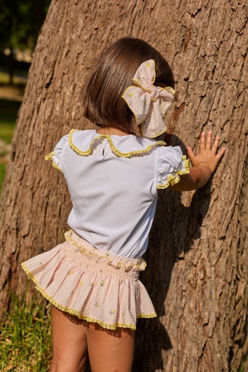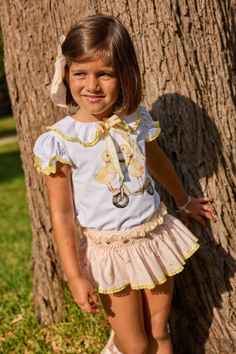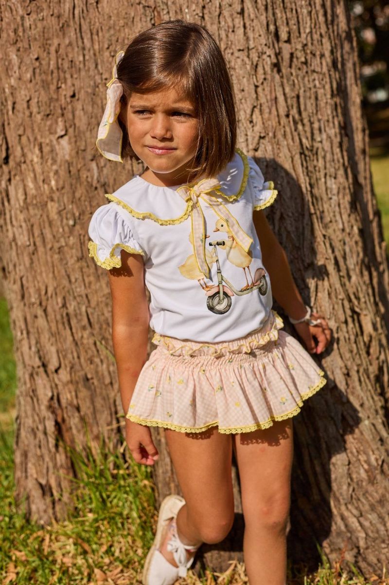- Conjunto niña formado por camiseta pollito y falda vichy limones.