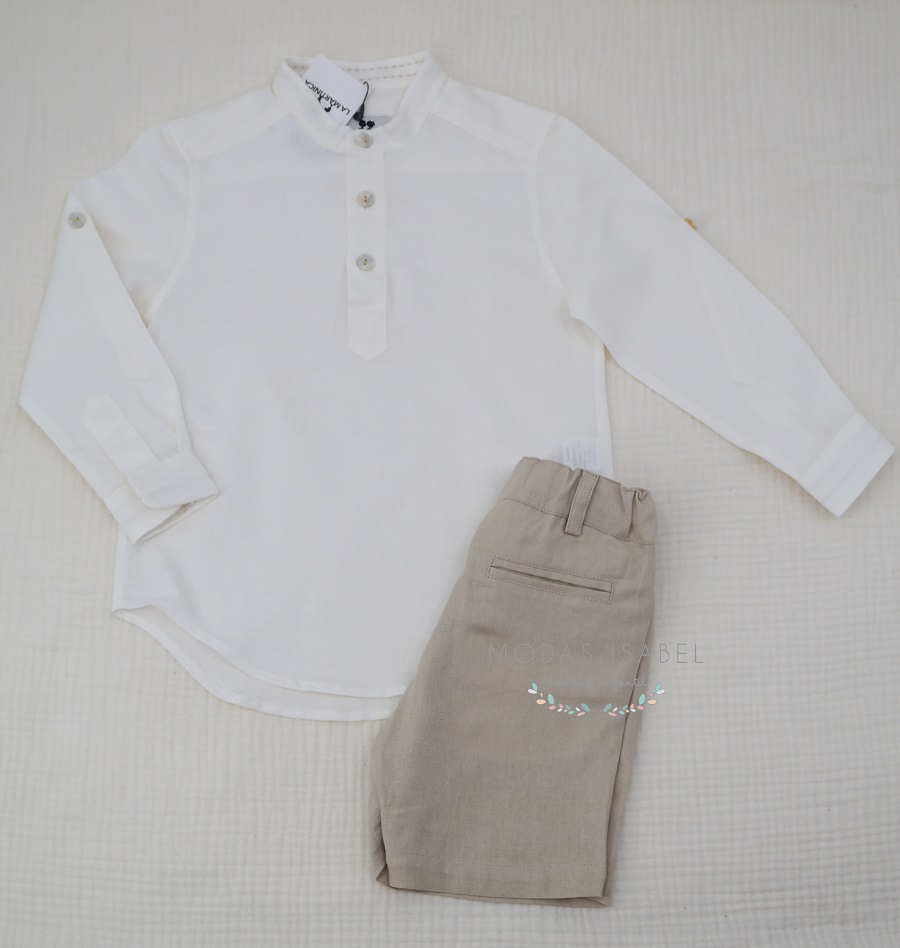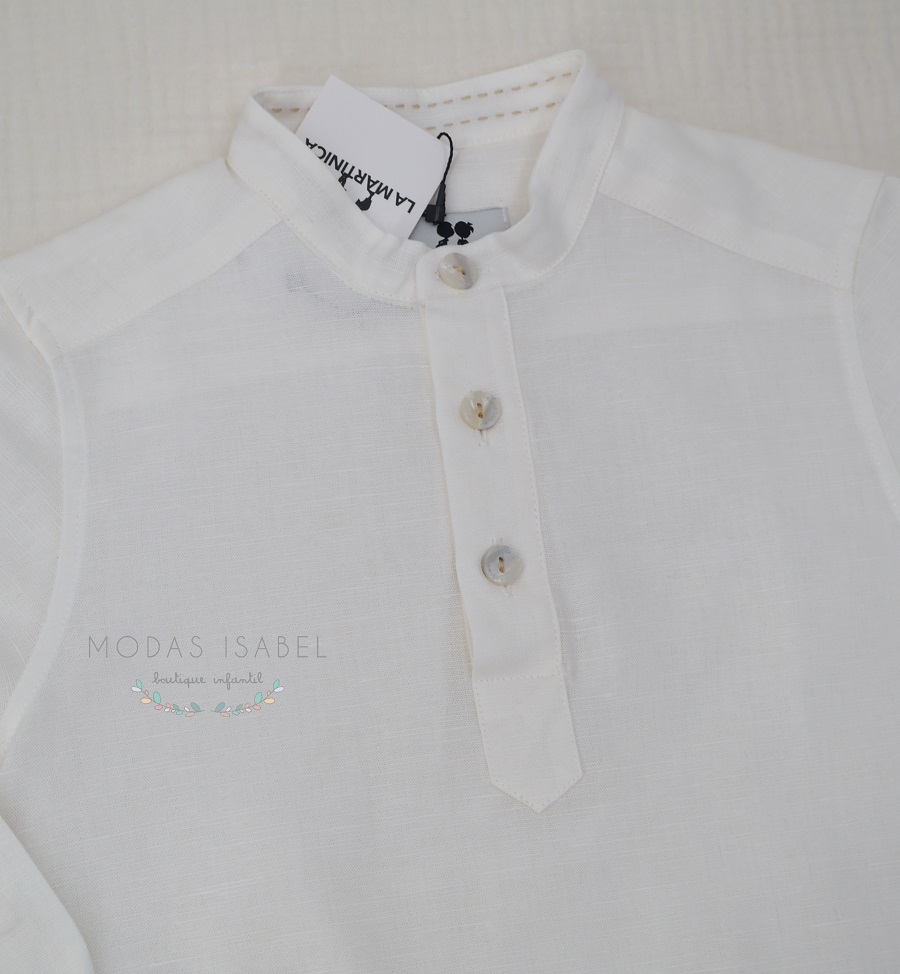 - Camisa niño cuello mao de manga larga confeccionada en tejido de lino blanco roto.