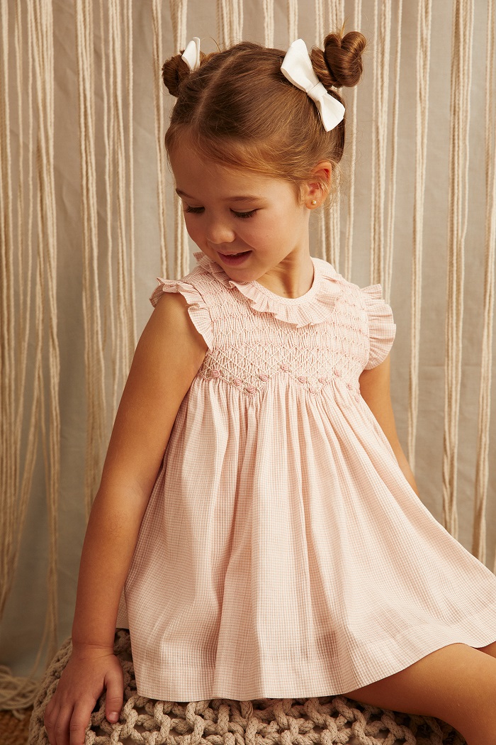 - Jesusito niña sin mangas con cuello volantito confeccionado en tejido vichy rosa con el pecherin bordado a mano con nido de abeja.