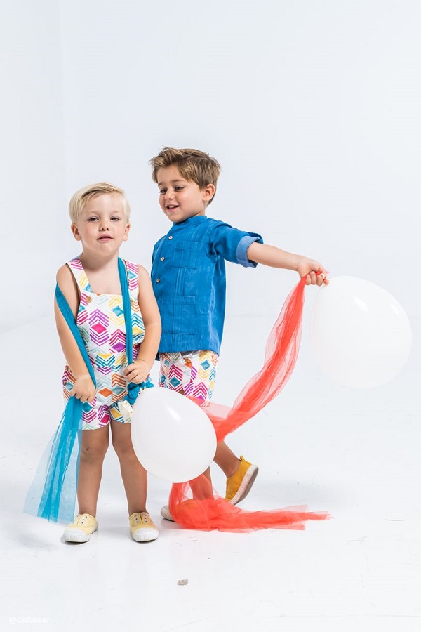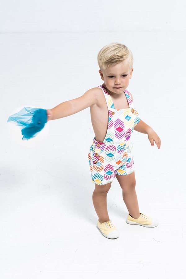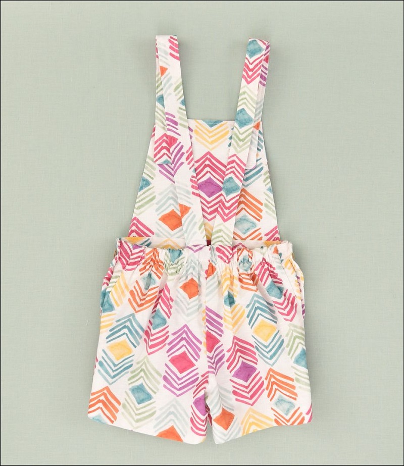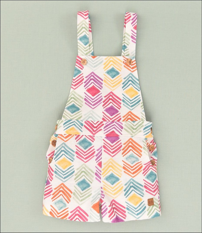 - Peto unisex de tirantes confeccionado en tejido estampado multicolor: naranja, morado, amarillo y verde agua.