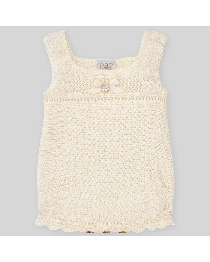 - Ranito en color beige de punto diseñado para bebé, con cuello cuadrado y cierre trasero con botones. Cierre en la entrepierna para facilitar el cambio de pañal. Adorno de lazo con botón de nácar decorativo en la pechera. Punto mercerizado y detalle de puntillas.