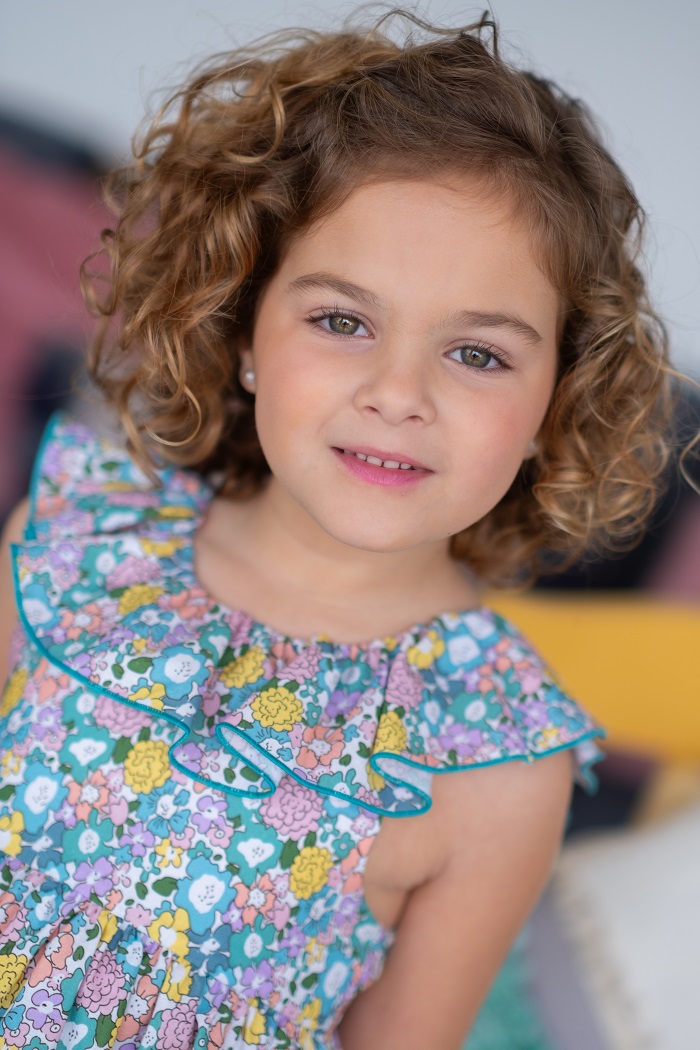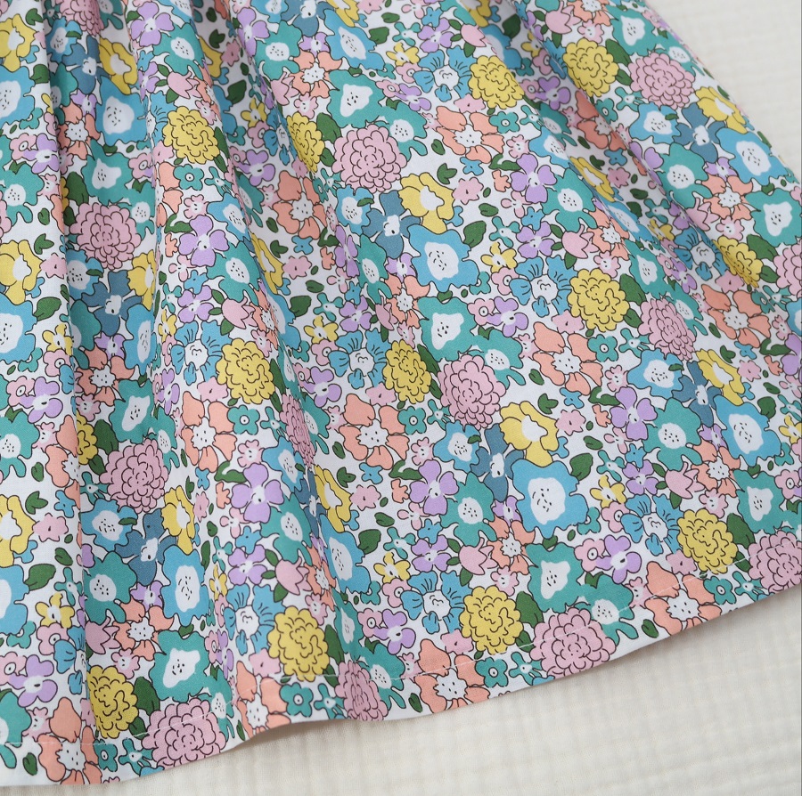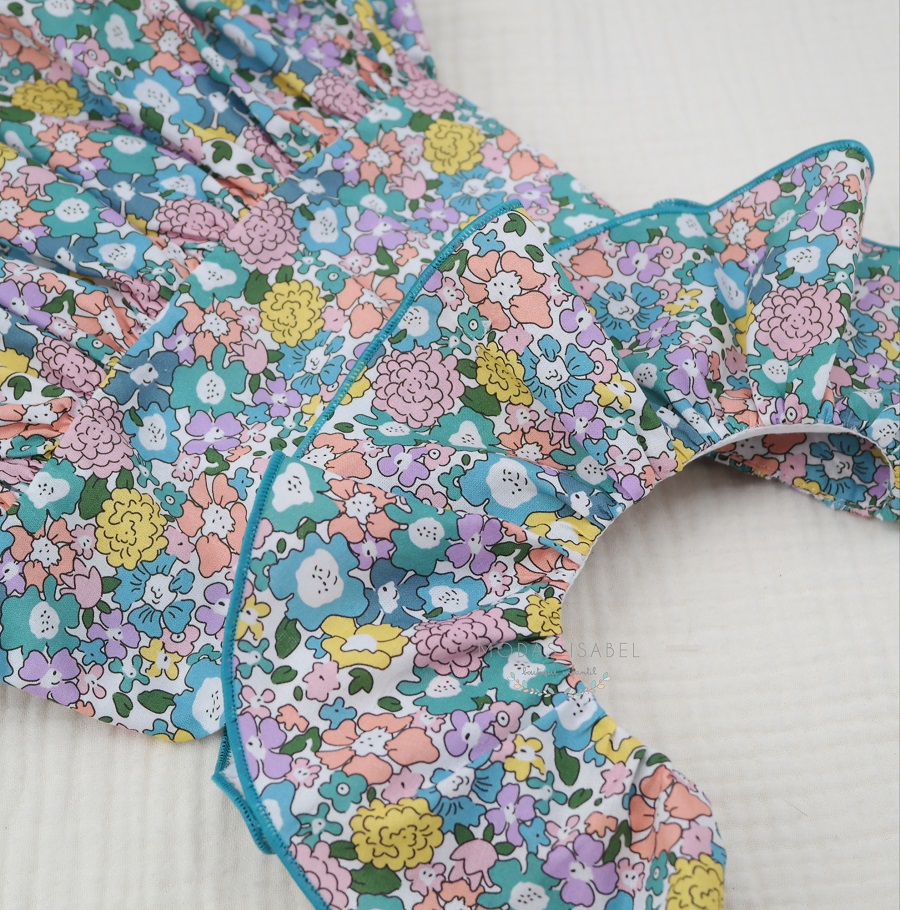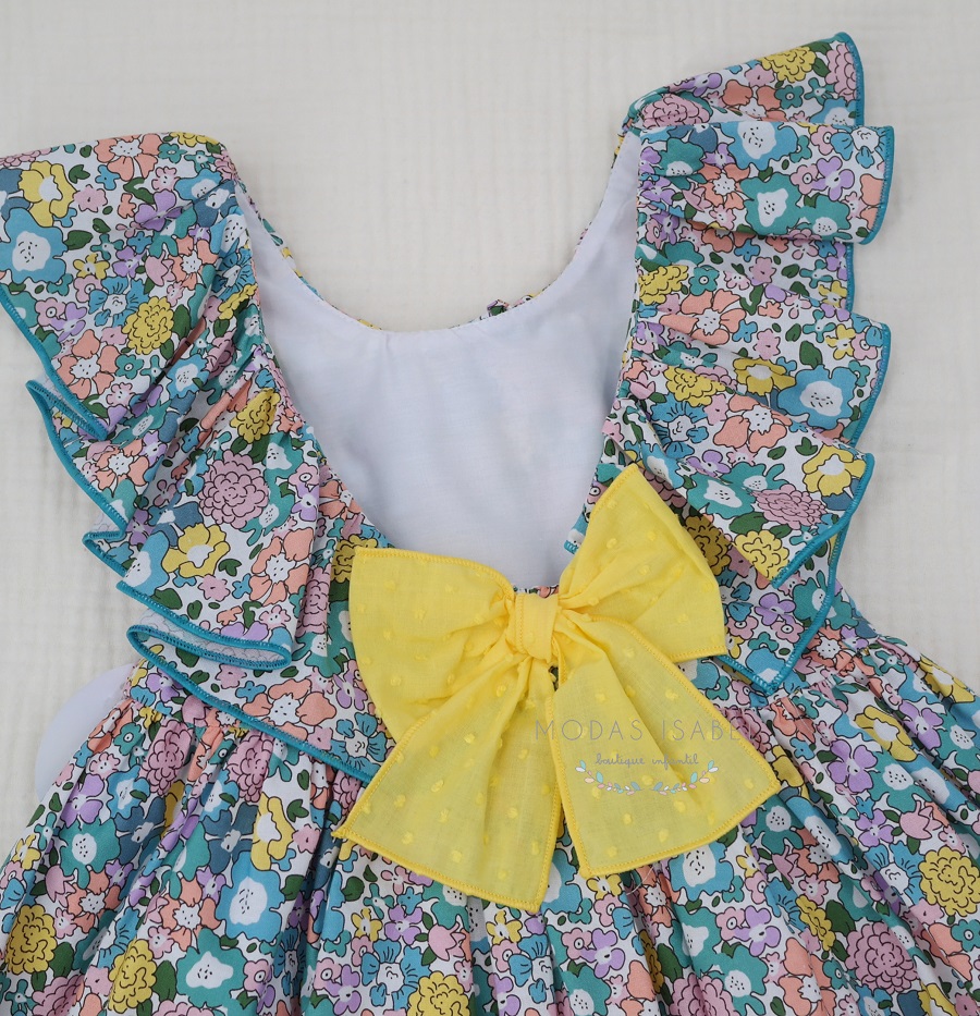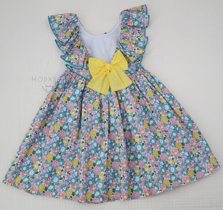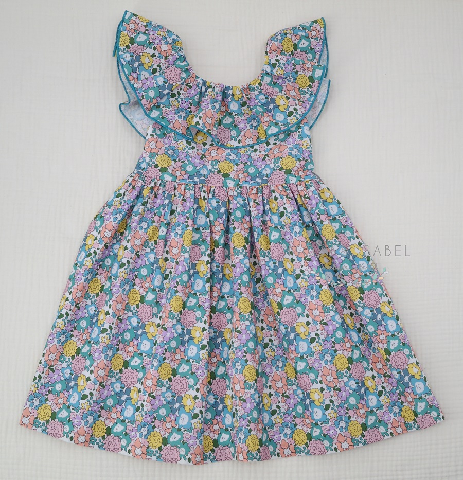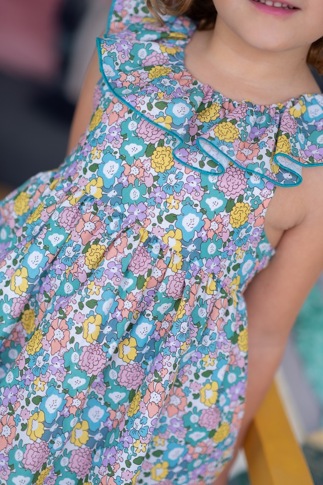 - Vestido vuelo con cuello volante confeccionado en estampado de flores liberty en tonos amarillo, malva, turquesa y verde.